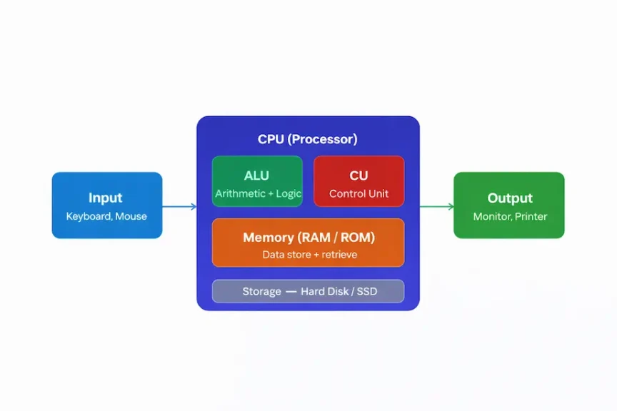 Input → CPU (ALU + CU + Memory) → Output – यही है Computer का basic architecture